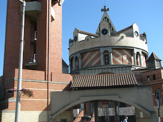 Na sequência deste post e, tendo por acaso ido parar à Portela, resolvi entrar na Igreja que tanto me fascinou. Pois bem, se o seu exterior é por si só diferente (circular, enorme e com um material que parece tijolo), o interior é igualmente fantástico: despretensioso, bonito e com mensagens interessantes, além de alguns aspectos mais curiosos como estruturas piramidais, a ave representada na foto ou até mesmo a música dos sinos que era diferente das habituais. Um grupo de senhoras rezava o terço na frente e outras, espalhadas ao longo da igreja, ajoelhavam em prece. Se há locais místicos, a igreja católica (! perguntei até a uma velhinha que passava na rua, para confirmar) do Cristo-Rei da Portela é, certamente, um deles. Vale a pena a visita.